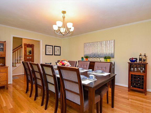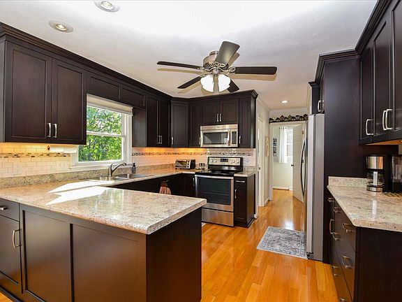 A rocking chair front porch invites you into a meticulously maintained and updated Colonial located on a quiet cul-de-sac street. Gleaming hardwoods on the first floor which features an updated kitchen w/custom cabinetry and stainless steel appliances flowing into a FR, LR and DR all featuring designer neutral paint colors. Laundry and 1/2 bath complete the entry level. A generous primary suite w/hardwood flooring and updated bath, three more BR,s and 2nd full bath complete the upper level. Daylight walkout basement features a front to back family/rec room and over-sized 2 car garage w/lots of storage and work space. Well manicured landscaping, deck and patio provide excellent outdoor space. Detached. storage shed for extra storage. 50 year roof (2023) with transferrable warranty.