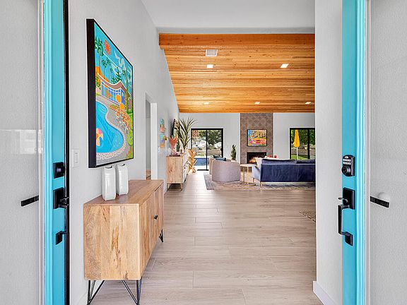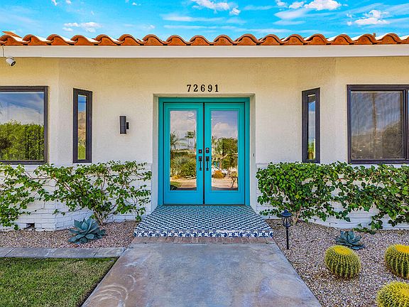 This fully furnished, professionally designed home in South Palm Desert offers modern style perfectly balanced for comfort with indoor-outdoor living. Extensively updated throughout, the open floor plan features vaulted ceilings, a spacious living room, a generous dining area, and a spectacularly renovated kitchen. Sliding doors from the living room open to a private backyard featuring lush landscaping, artificial turf, a beautiful hand-painted mural wall, and an immaculate saltwater pool with spa.Inside, entertaining is easy with the fully updated kitchen completed in 2023. Here you have quartz waterfall counters and striking tile backsplash, a dine-in prep island, and a sitting counter at the separation to the living room. Other features include a bar area, pantry, updated stainless steel appliance package, and sliding door access to the front patio.The expansive primary suite offers sliding doors to the backyard pool area and a spa-inspired bathroom with access to the large walk-in closet. Two additional bedrooms are located in the main house: one with backyard access near the full guest bath and a front bedroom with an ensuite bath. The fourth bedroom is part of a private attached guest house, complete with its own bathroom, full kitchen, and sitting and dining areas. This space has backyard access with separate patio, a dedicated washer and dryer, and dual ductless mini-split A/C systems, providing privacy for guests or the possibility for rental, or caretaker's quarters.Just minutes from El Paseo's premier shopping and dining, along with being sold furnished, this home is ready for you to purchase and enjoy immediately.