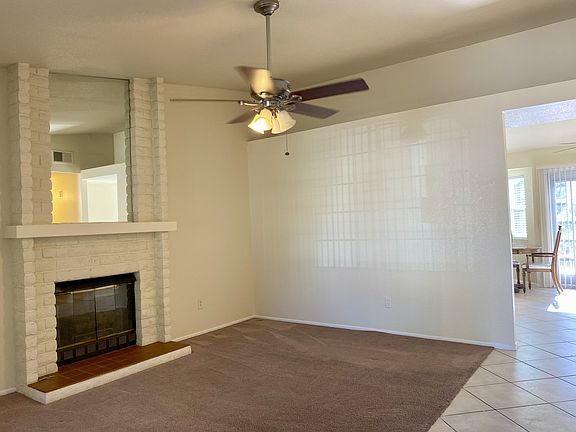 Step inside to an inviting open floor plan featuring vaulted ceilings, abundant natural light, and a cozy living room with a brick fireplace perfect for relaxing or entertaining guests. The kitchen is equipped with ample cabinet storage, a breakfast bar, and direct access to the dining area.