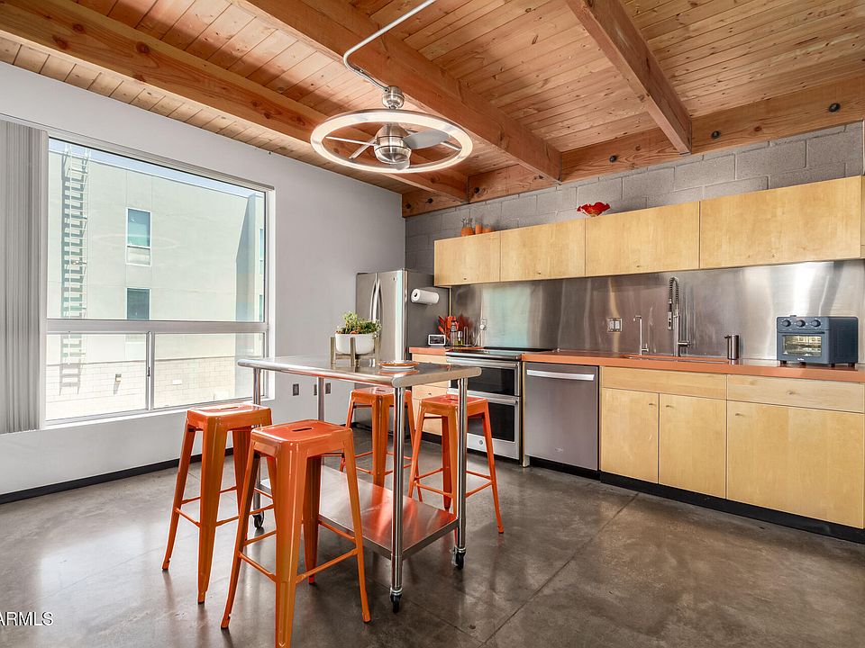 Unique 3-bed, 2-bath NYC-style loft in vibrant Downtown Phoenix! This corner unit boasts beautiful exposed block walls, stunning wood ceilings & beams, hardwood & cement floors & no carpet anywhere! Includes a versatile BONUS ROOM, currently an exercise space, which can serve as a family room or bedroom. Private bedrooms WITH doors (rare in this complex). The primary bedroom has 2-story high ceilings, a custom floor-to-ceiling closet & a loft. Sleek kitchen w/modern appliances, including a unique oven-and-a-half setup, perfect for culinary enthusiasts. Enjoy gorgeous views from most windows, a lovely quaint backyard & garage. High ceilings throughout enhance the open, airy feel. Relax in the heated & cooled community pool. Live just steps from restaurants, shopping, art district, Pro sporting & concert events & more!