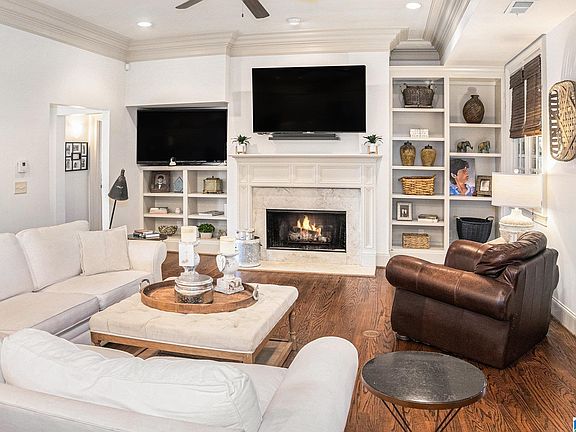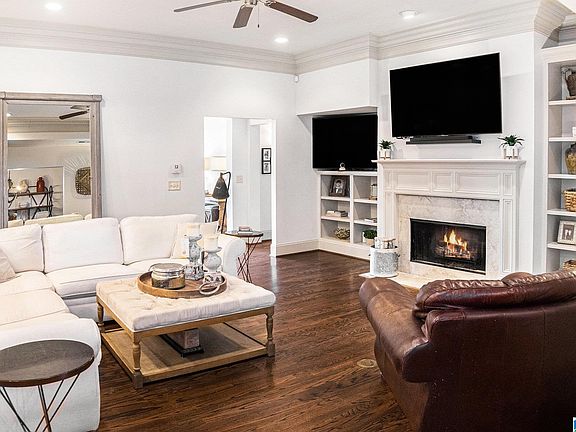 Liberty Park’s Hampden Place. This spacious 4 bedroom, 4.5 bath home offers a functional layout with generous living spaces and an updated kitchen featuring Sub-Zero refrigeration, pebble ice maker, quartz countertops (updated two years ago), walk-in pantry, and ample storage. The main-level primary suite includes a large bath with separate vanities, soaking tub, shower, and two walk-in closets. Upstairs, each bedroom has its own private bathroom, with excellent privacy between rooms for guests, teens, or multi-generational living. Additional conveniences include multiple linen closets, a roomy laundry area, and abundant storage throughout. A covered patio with fireplace, and large screen TV, overlooks a very large fenced backyard, ideal for pets, play structures, and the covered patio extends living outdoors year-round. Close to parks, lakes, playgrounds, and award-winning Vestavia schools.
