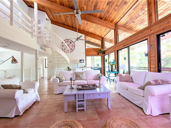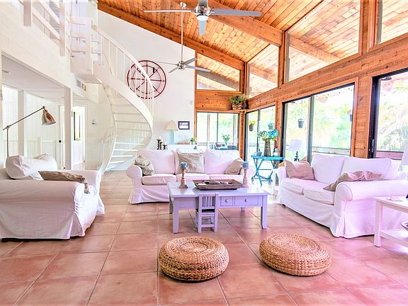 Checkout the virtual tour! Enormous 12,600 sf lot with truly ONE-OF-A-KIND spectacular & spacious elevated beach home in North Anna Maria, just steps from the pristine white sands of secluded Bean Point Beach. This home will WOW you & your guests with soaring 17 ft vaulted ceilings, classic wood accents throughout the home and an exquisitely crafted contemporary wooden curved staircase. Amazing architectural detail with mid-century modern influences. Huge screened balcony spans the length of the home adding seamless additional entertaining areas from living areas and overlooks a over-sized resort style pool, water feature and even more places to spread out. There is so much space for lounging and playing around the HEATED pool without skimping on garden space and lush landscaping . Private shaded lounging areas under the home overlook the pool & provide creative flexibility on entertaining. Master is conveniently located on the main floor while the other 2 bedrooms are upstairs. So many windows allow lots of mood elevating light to stream throughout the home, making this the perfect vacation home or full time residence. Two car garage along with lots of parking space in front of home. Fantastic rental history makes this a real money maker. If you are a looking for a unique Beach Escape without compromising indoor and outdoor space on a huge lot, you have found it right here!! You absolutely will not find another home on the island like this jewel! Call to schedule your private viewing today.