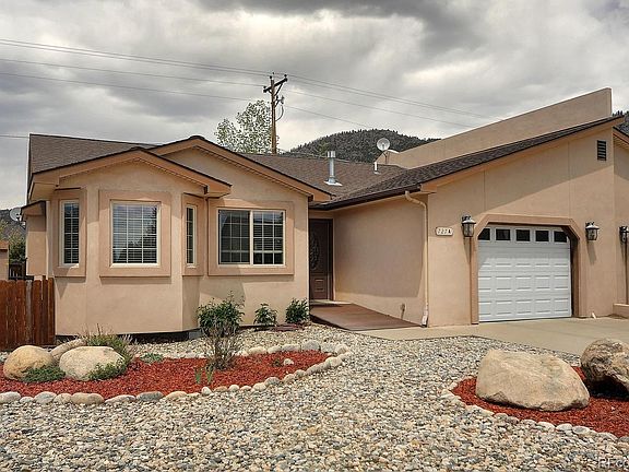 Convenience and easy living characterize this one level residence within walking distance to all the downtown Buena Vista amenities. 3 bedrooms, 2 baths, 1 car garage, fenced yard plus a storage shed avail all the conveniences at an affordable price! Open great room is larger than imagined with gas stove for comfort, great kitchen space and separate dining area with easy access to the covered deck and private back yard. Carpeted living room flows nicely into the sizable kitchen and adjoining dining room, both tiled for easy maintenance. Suprisingly spacious kitchen includes expansive Oak cabinets, formica tops establishing great work and entertaining space. The master suite is located at the front of the house providing a private retreat to delight in the natural sunlight, full bath and sufficient closet. Two additional bedrooms and 3/4 tiled bathroom are efficiently designed for comfort and flexibility. This home could easily be used for short term rentals as well as part-time or full-time residential space. This is the west half of a duplex, low maintenance stucco exterior with the privacy of a single family residence. Concrete driveway, sidewalks and nature trail are easily accessible for bike-ability to the Arkansas River, shopping, restaurants and parks.