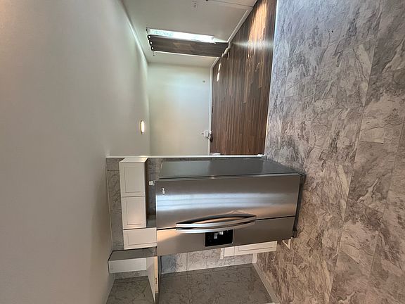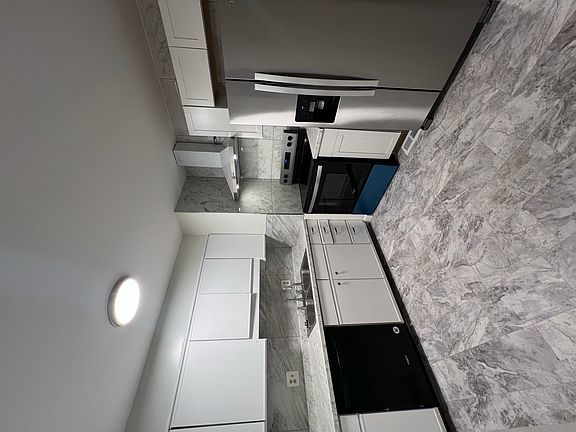 Modern Kitchen Outfitted with brand-new stainless-steel appliances: refrigerator, range, hood, and dishwasher.