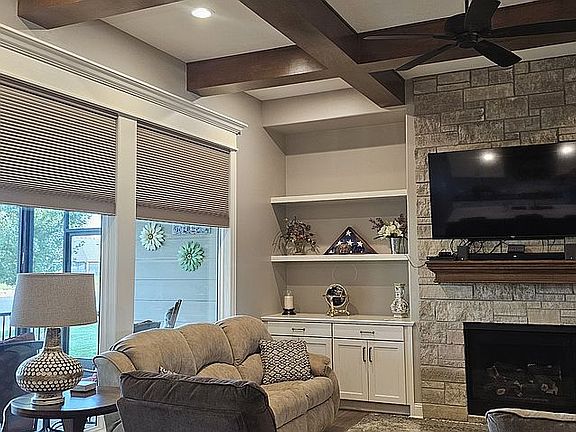 Beautiful 3Bd & 2Bath Patio home. Living room has gas fireplace, wood shelves & cabinet with wood beams in the ceiling. It has a fully tiled walk-in shower & large closet with laundry room adjacent in master bedroom. Covered screened in patio, walk-in pantry & a safe room. A impact resistant roof & security system that qualifies for insurance savings. The garage has an epoxy floor, storage cabinets & is fully insulated. Fully landscaped, sod & sprinkler system with a well on a lake lot. Neighborhood clubhouse, salt water pool, and stocked fishing lake.