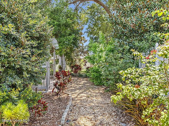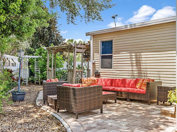 Beautiful updated manufactured home in Barefoot Bay. New roof in 2023. The yard has a paver patio, fruit trees, and park-like setting. Inside, you'll find updated vinyl flooring throughout and a large island kitchen with plenty of space for cooking and entertaining. Oversized large living room and a dining area that connects to a sunroom that overlooks the yard. The primary suite includes a walk-in closet, walk-in shower with seat, pedestal tub, dual sinks, and marble countertops. Washer and dryer inside unit, ceiling fans, and good storage throughout. Barefoot Bay offers great amenities including golf, multiple pools, tennis courts, a private pier, and more.