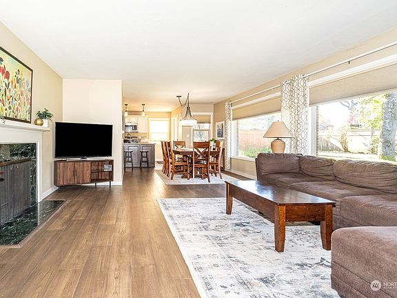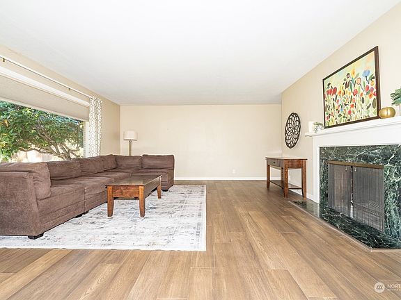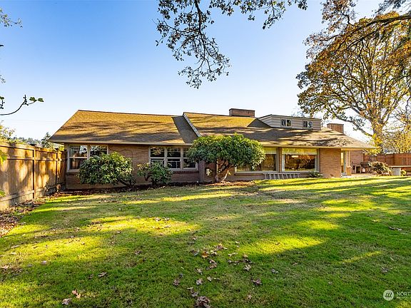 THAT home is for SALE? I've always loved the setting! Check out this classic 4-bedroom Brick Rambler. Formal living/dining with wall of windows looking over a beautiful backyard. Beautifully remodeled Kitchen with center island and hard surface counters. Hardwood and engineered flooring throughout the entire first floor. Cozy den/family room with fireplace. Abundant storage plus a huge attic. Tucked away is a 4th bedroom that is a perfect hideaway for guests or home office. Double corner lot with stately oaks and firs and Nicely landscaped. Concrete patio with brick fireplace. Wonderful home in super neighborhood.