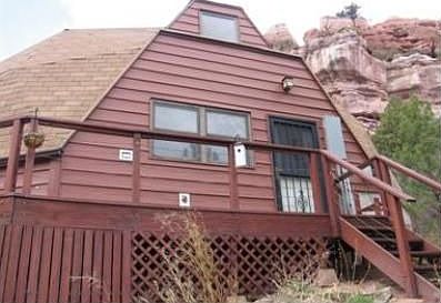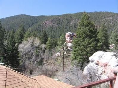 Just reduced - amazing price for this area! Geodesic style with Geodesic detached garage. Treed acre with gorgeous red rock formations! Open floor plan with updated kitchen & baths. Freshly painted interior. Private deck w/ hot tub. Unique property in a unique location. Access to Pike National Forest. No appliances. Sold 'AS IS'. Buyer required to obtain pre-qual.