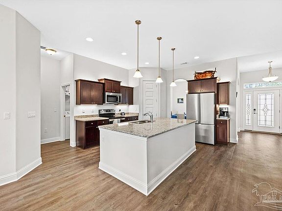Modern Elegance Meets Coastal Comfort in Navarre's HBTS Community. Step into luxury with this stunning 3-bedroom, 2-bath home built in 2023 by Whitworth Builders Inc. (includes transferable 10yr Structural Warranty by Maverick). Designed with an open-concept Caymate Key II floor plan, this 2,151sqft. residence offers both functionality and sophistication—featuring a flex room and a dedicated dining space to accommodate your lifestyle needs. At the heart of the home, the chef's kitchen shines with a large granite island, backlit cabinetry, and an effortless flow into the spacious living area. Towering 10-ft ceilings and E-glass windows create an airy ambiance, flooding the space with natural light and offering peaceful backyard views. Retreat to the primary suite, where a double vanity, a deep soaking tub, and a signature zero-entry walk-in tile shower set the tone for relaxation. Custom built-in closet organization adds a refined touch, ensuring both luxury and practicality. Located in the sought-after Holley by the Sea community, this home provides exclusive access to world-class amenities- including a private beach and boat launch, three pools, a fitness center, and courts for tennis, basketball, and pickleball. This is more than a home- it's a lifestyle. Schedule your private tour today!