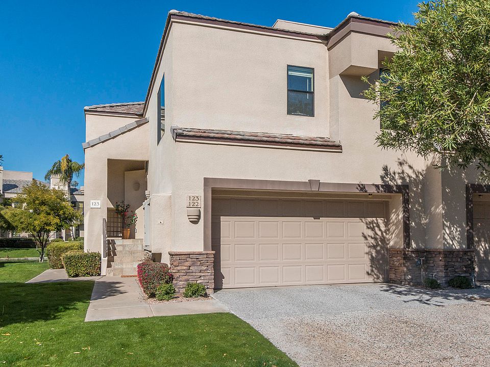 You'll love this beautiful end-unit townhome in highly-desired Gainey Ranch that offers 2 bedrooms & 2 baths in 1470 SqFt. The great room features soaring vaulted ceilings, golden oak wood laminate flooring & wall-mounted electric fireplace with travertine surround. Sliding doors lead out to a spacious balcony with beautiful lagoon & common area views, retractable awning & storage area. The kitchen features white maple shaker-style cabinetry with under-cabinet lighting & glass fronts, wine storage, granite counters, glass tile backsplash, stainless appliances, pantry with pull-out drawers, and breakfast bar for casual . The master retreat has two closets with built-in shelving & private bath with dual sink granite vanity, jetted tub & tiled shower. Guest bath also has a granite vanity and oversized tiled shower with frameless glass. Other features include an attached 2 car garage with cabinets & epoxy floors, alarm system, skylight & much more! Community amenities include resort-style pools, spa, tennis courts, community/fitness center, 9-hole golf course & also access to the 18-hole course at the neighboring Hyatt hotel. Schedule a private showing today!
