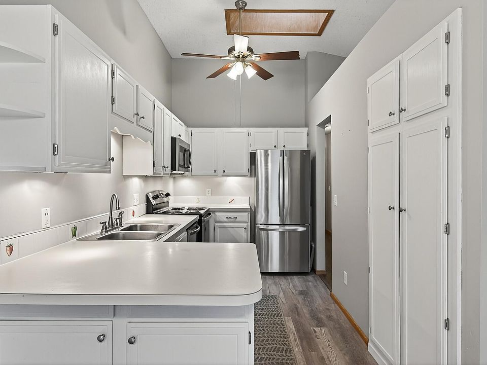 Full-wall brick fireplaceSpacious primary suiteBuilt-in storage shelvingFresh brand-new carpetVaulted ceiling with skylightNatural lightAttached tuck-under garage