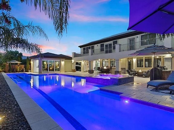 Gated luxury estate with over 5,200 sq. ft. of living space! Features include 5 bedrooms + loft + theatre room + casita with full bath/appliances. Two-story primary suite offers loft, office, spa bath & balcony. Stunning kitchen/bar remodel with GE Monogram appliances & custom cabinetry. Resort-style backyard boasts an Olympic-style pool & spa, new heater/filter, LED lighting, BBQ, resurfaced balcony, child safety fence & dog run with misters/cover. Energy-efficient upgrades: fully paid solar, Tesla charger, 4 new (2022) 16-SEER AC units w/Nest thermostats, R60 attic insulation, water softener & filtration system. Enjoy stackable sliding doors for seamless indoor/outdoor living, smart garage, epoxy flooring & whole-home video surveillance. RV-ready with 50-amp hookups, water/sewer, electric RV gate. Sauna, theatre, and luxury upgrades throughout make this a true one-of-a-kind home!