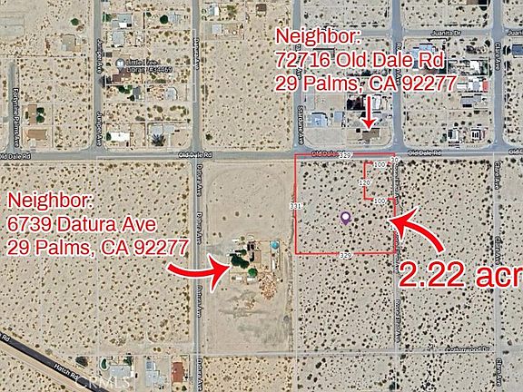 This exceptional 2.22-acre property (APN: 0616-141-07-0000, San Bernardino County) boasts 329 feet of frontage on the paved Old Dale Road, just off the 29 Palms Highway (CA State Route 62). Nestled in the highly sought-after SmokeTree neighborhood, this lot offers stunning panoramic hillside views and easy, paved road access. Utilities are conveniently located in the street, making it ideal for your dream build.