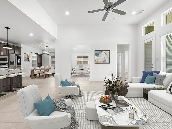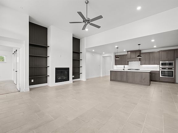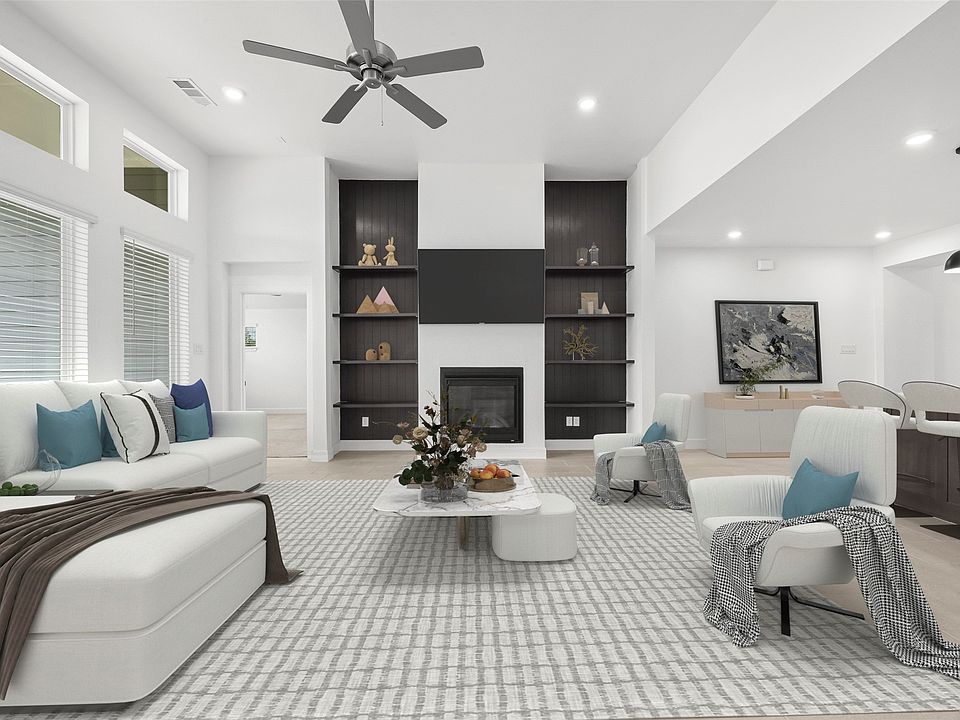 Step inside and experience soaring 12’ ceilings, an open floor plan, and a show-stopping kitchen at the heart of the home. With an oversized custom pantry, a touchless motion-sensor faucet, and seamless flow into the living area, this space was built for both everyday comfort and effortless entertaining. The living room features a cozy fireplace framed by custom built-ins, creating a warm and inviting focal point.