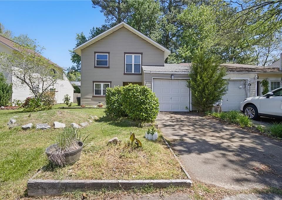 Sellers will install buyers choice of carpet & paint color prior to settlement. 3 bedroom, 1 1/2 bath twinhome w/Car garage, located in the heart of Va Beach. This home has some great space & features just needs a little elbow grease to shine. Roof & fence are appx 5 years old. Fireplace insert has been replaced since they owned it. Dishwasher 1 year old. French doors in family room replaced. Remainder of a home warranty thru Sept 2025 can convey as well. If there is a transfer fee, buyer to pay that cost. Large kitchen with granite tile tops, stone look backsplash, & ceramic tile floors. Dining area butts up to the kitchen to a step down family room with vaulted ceiling, 2 ceiling fans and french doors to the backyard. Primary bedroom has doors that open to overlook the family room if desired. 2 other bedrooms and upstairs and a full bath. Close proximity to shopping, restaurants, military bases & interstates. Seller to provide clear termite letter. No HOA fees!