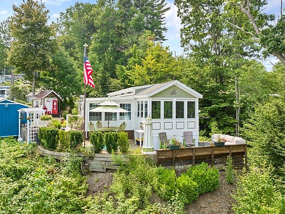 Discover this rare GEM: a striking Park Model boasting an awe-inspiring view of Lake Winnipesaukee and the surrounding mountains. Built in 2021, this home features two bedrooms, one full bathroom, and a cutting-edge DURABILT three-season addition with 4-inch foam insulation and insulated windows that enlarge the living space. Revel in the model home ambiance with new flooring, stainless steel appliances, glass tile in the kitchen and bathroom, a clawfoot bathtub, and a tower washer/dryer. The design is thoroughly contemporary and chic. Scenic View Resort provides a private beach for members with day docking, picnic tables, and moorings available through a lottery system. Enjoy watching the Mount Washington cruise past or eagles soaring from your deck. For those seeking excitement, Weirs Beach offers numerous restaurants, shops, and entertainment. Alternatively, visit the nearby Meredith Village, BNH Pavilion in Gilford for premier concerts, or Downtown Laconia for the Colonial Theater! Experience life in the HEART of the Lakes Region!