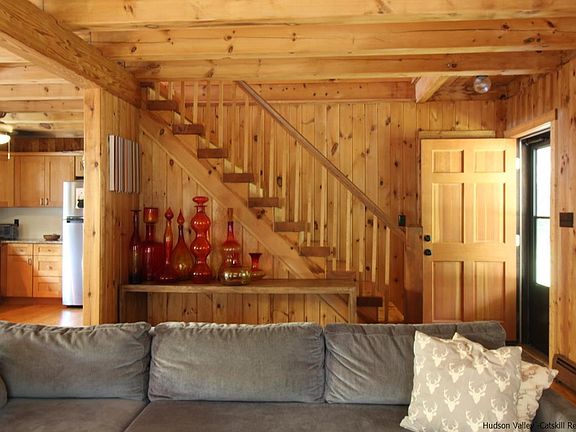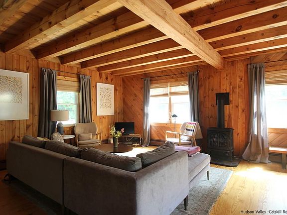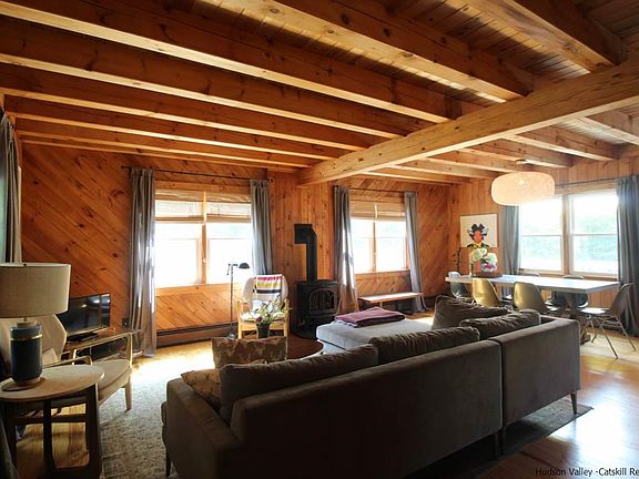 Set on 2.5 private acres, on which the house sits about in the middle, the bonus here is the deeded use of scenic Sand Lake, a short and pretty stroll from the house. Entering from the welcoming front porch, the exposed rafters in the living room and throughout the ground floor reinforce the impression that this is a sturdy and well-designed home. The open concept kitchen, dining and living areas flow nicely, and include a breakfast bar and exterior access to the back deck. The propane-fired Jotul stove in the living room provides supplementary heat and a pleasing wintertime ambiance, while the kitchen features Shaker-style cabinetry and stainless steel appliances. The hallway off this area includes the one ground floor bedroom, with double-size closet, a full bathroom with shower, hook-up for washer and dryer and an exterior access to the side of the house, which is near the shed. The upstairs landing can be utilized as a home office, while 2 bedrooms are off to the left, one with a dormer window providing architectural interest. The master is off to the right of the landing, and is en suite, with a shower. But in the spacious bedroom itself, a steeping tub adds an almost sculptural, not to mention luxurious, element to the room. The finished walk-out basement adds a whole other world of space and uses. It's both a rec room, and a home theater; a space where the whole family can comfortably gather. It enjoys a decent amount of natural daylight too. The 2.5 acres have a number of nooks and crannies, with perennial landscaping adding bursts of color and interest throughout. Beyond the flower beds and the lawn out back, a fire pit area has been created just in the woods, still visible from up on the deck. Further in, the path leads to a sunny clearing, great for whatever games or pastimes you can dream up. There are 2 access points to Sand Lake which are deeded to the owners of this house, the closest of which are usable by only a very few owners, and is therefore blissfully peaceful. You can keep your canoe or kayak down there, and wade along the sandy bottom before the clear waters deepen for great swimming. In winter, grab your snowshoes for a cross-lake hike, or your rod for a spot of ice fishing. It's all on your doorstep. This property is just minutes from the food, shops and activities that have really brought Livingston Manor to people's attention in recent months.