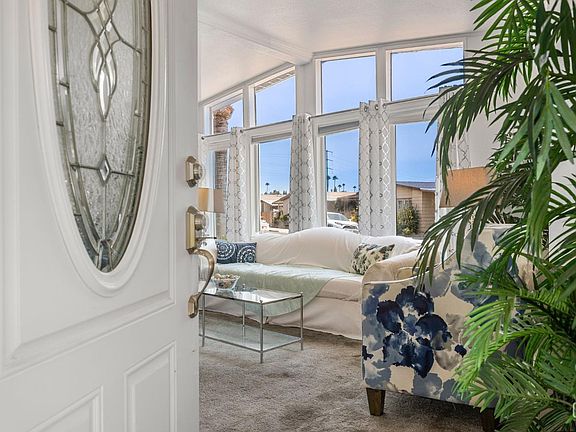 Tall palm treesTons of windowsGlass tile backsplashPendant lightsBuilt-in hutchRemodeled bathroomsGleaming countertops