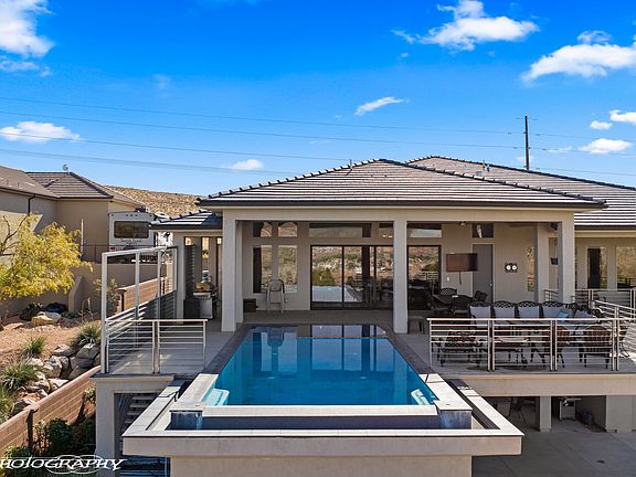 The perfect forever home, second home or investment property! 3 FULL kitchens with custom cabinetry and 3 laundry rooms. Includes a mother-in-law apartment on the main level with a private entrance, and handicap accessible. The Best Views in all of St. George. From the moment you step inside, the perfect combination of elegance and warmth will take your breath away. The open floor plan mixed with the unobstructed views will satisfy. Features 8 bedrooms, 7 full and 2 half bathrooms, The basement apartment includes 3 bedrooms and 2 bathrooms, super private. Stunning heated infinity pool and spa with misters and a fire pit, perfect for entertaining. All furniture and appliances are included!! (Artwork and statues are excluded). The main kitchen is complete with stainless steel appliances featuring double ovens, gas cooktop, an oversized island and a hidden pantry. Beautiful backlighting throughout the home. Large master bedroom, wake up to views of the mountains and city. Motion lights in master bathroom, custom closets. 12 ft ceilings on the main and 10 ft ceilings in bedrooms and basement. 2x6 construction all insulated, 4 separate systems for the HVAC! LVP flooring with weatherproof corkboard. Hidden vault in basement. Every interior wall very well insulated and sound proof. Pool equipment includes 4,000-gallon overflow, full automation with app. 7 car garages are extra width and depth, tons of shelving for storage. Plenty of parking for the family and guests. Enjoy the peaceful evenings and gorgeous sunsets. Views all of Snow Canyon, South Gate Golf Course, Tuacahn and Pine Valley Mountains! Fruit trees and garden boxes are perfect for your hobby if desired.