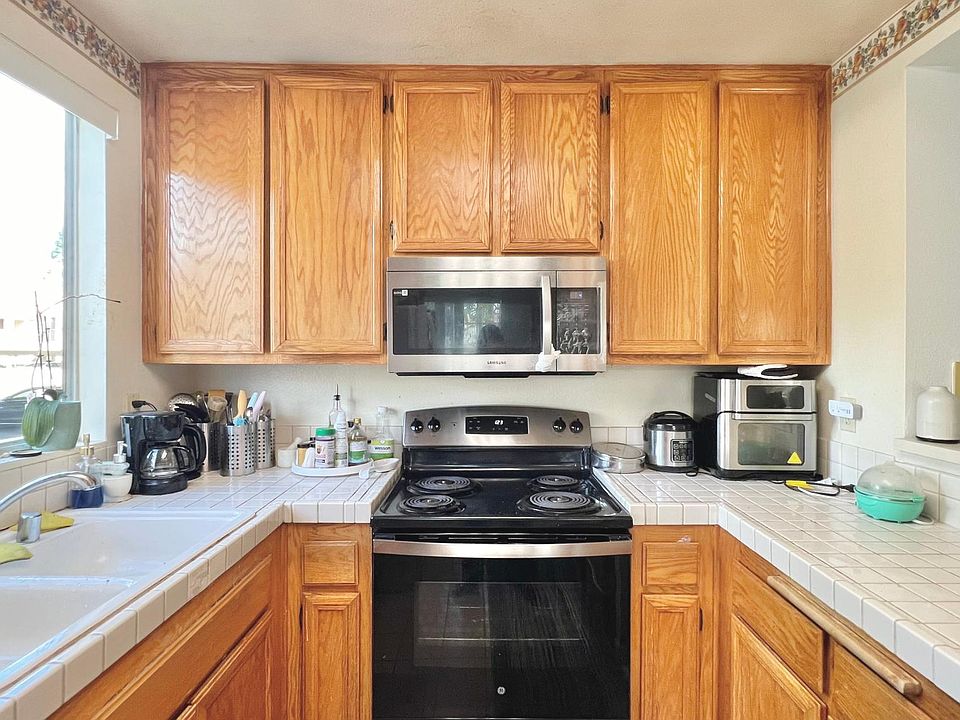 - Kitchen features stainless appliances, tiled flooring, lots of storage, and a big window allowing fresh air and light to come in.