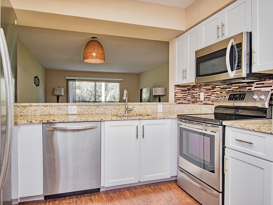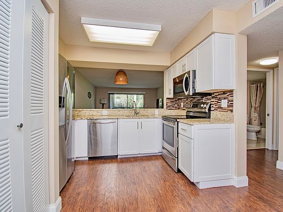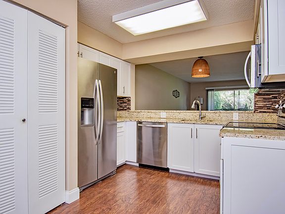 Private tropical garden view with large screened patio. updated kitchen with granite counters, stainless steel appliances, and wood laminate floors. The furniture from approximately 2019 will stay too . A/C 2018. Huntington Lakes clubhouse was recently redone and popular for its resort style amenities, like a large indoor pool, state of the art fitness center, pickleball courts, racquetball courts, tennis courts, bocce courts, multiple card rooms, scheduled activities and a 610-seat theater!