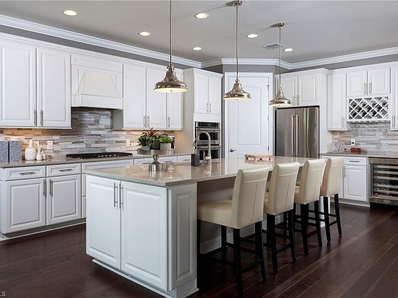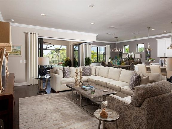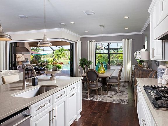 This gorgeous home sits on a private street of 15 homes. It is perhaps the most scenic home site in Winding Cypress, with preserve land both in the front and rear and a beautiful lake on the rear and side of the home. It also has an expansive view to a second lake. As you enter the home the wooden floors and coastal transitional design leads you to the expansive opening to the large expanded lanai and a beautiful salt water pool with floating spa and 3 waterfall features. All surrounded by lush vegetation. Outdoor lighting highlights the garden at night. The home has over $300,000 in upgrades. Included are custom office cabinetry, gourmet outdoor kitchen with sink, range burners and grill, upgraded kitchen with wine cooler, crown molding, recessed lighting, fully built out laundry room, impact windows throughout and many architectural features.