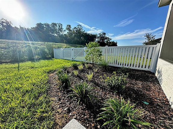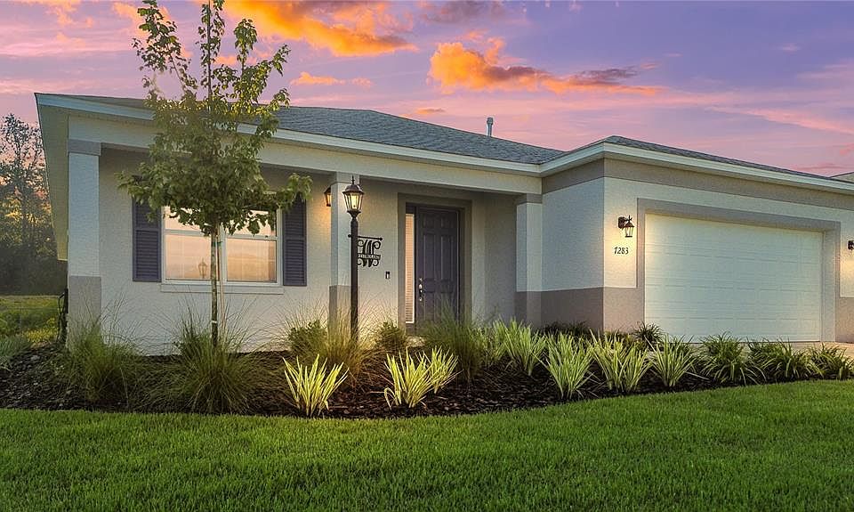 2025 WISTERIA MODEL FOUND HERE! Built in 2025 with upgrades galore, this Wisteria model is nestled in the new community of Weybourne Landing located within Ocala's premier 55+ 'On Top of the World'. Gated access adds privacy and exclusivity when entering the neighborhood, where you own your own lot (no land lease). Step inside your immaculate and airy Florida home, greeted in the foyer. The open-concept floor plan allows for full-home views of a stately and functional kitchen and great room living space; and the upgraded 24x24 tile flooring runs throughout the entire residence- no carpet to fuss over. The gourmet kitchen is an entertainer's masterpiece with its L-shaped island covered in quartz, soft closing drawers, specialty under-cabinet lighting, and full-sized walk-in pantry. New stainless steel appliances, including a gas cook top makes preparing meals fun and easy; and, the built-in microwave and oven add sleek lines and sophistication in the kitchen. The refrigerator can fit more than you may need, and the Samsung matching washer and dryer appliances convey as well! The primary bedroom suite overlooks the backyard, can easily fit a King-sized bed and nightstands, and offers two spacious walk-in closets for perfect organization. The ensuite bathroom adds the 'wow factor' balancing darker solid stone counters and tile. The walk-in shower was thoughtfully designed for wheelchair accessibility. Two more guest bedrooms split between another full bathroom with tub and shower combination creates the perfect space for loved-ones to visit. Enjoy the modern conveniences of Smart technology at home; and grab your favorite beverage and enjoy the sunsets from the covered front porch. Feel secure in parking both your vehicle and golf cart in the two-car garage. Outdoors, the irrigation system keeps the yard looking like perfection, and the back patio offers ample room to lounge or entertain. Weybourne Landing residents enjoy access to an amazing pool, fitness center, pickleball courts, dog park, clubhouse, mini-golf, and an outdoor pavilion with BBQ grills. The monthly HOA includes trash pickup and internet. Utilities include Teco Peoples Gas, Bay Laurel Water, Duke Energy, and Golden Leaf. Ask for a full list of UPGRADES in this one-owner, 2025 build! This property is everything you've dreamt about, chalk full of amenities, within close proximity to hospitals and medical care, great restaurants and entertainment including the Circle Square Cultural Center, and easy shopping outings- cruise by golf cart to your favorite destinations. Add this special home to your list of must-sees; you could be here before it's time to decorate for the holidays!