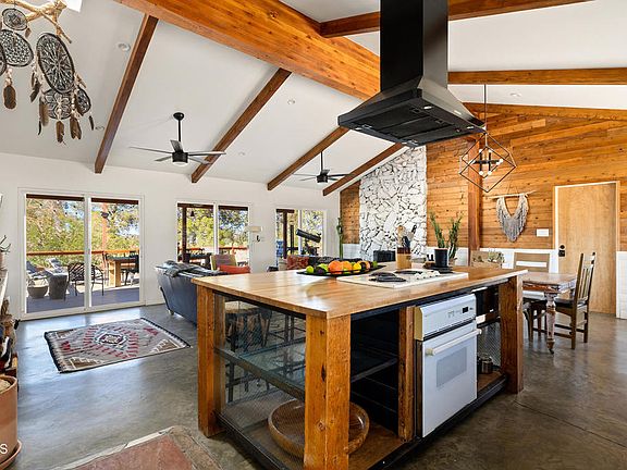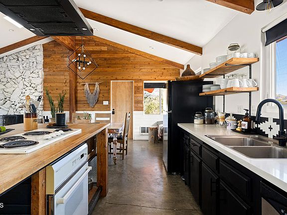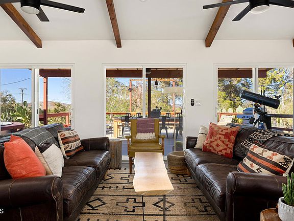 Welcome to 7284 Saddleback Rd, a rustic-modern bohemian oasis tucked away on a corner lot in Joshua Tree's coveted Friendly Hills neighborhood. Built in 1967 and thoughtfully reimagined, this 3-bedroom, 2-bath home--including a serene primary suite--blends midcentury character with modern comfort. Every bedroom opens to the outdoors: two onto private courtyards and one to the rear patio. The light-filled great room features reclaimed wood accents, high ceilings, and a striking rock fireplace, creating an inviting open space that connects the living room, chef's kitchen, and dining area--perfect for gathering and entertaining. Step outside to 1.25 acres of desert beauty with panoramic views, where a cowboy tub, hot tub, firepit, hammocks, swingset, and multiple lounging areas invite relaxation under the sun or stars. An attached two-car garage offers storage or potential, along with a charming detached cottage, currently used as a bunkhouse with its own deck and power. Just minutes from Crossroads Cafe, The Dez, the weekly farmer's market, and the Joshua Tree National Park entrance, this home captures the essence of desert living--offered fully furnished, with an EV charging outlet, ready for your next adventure.