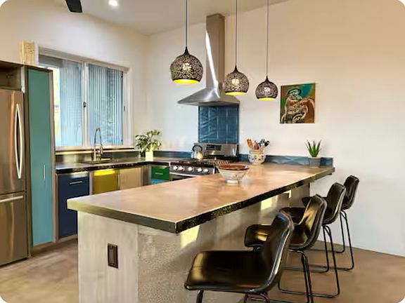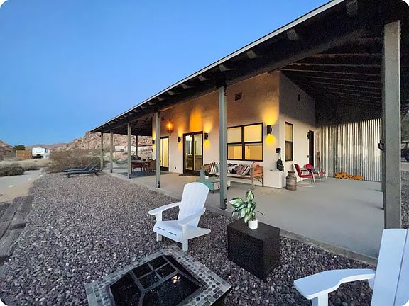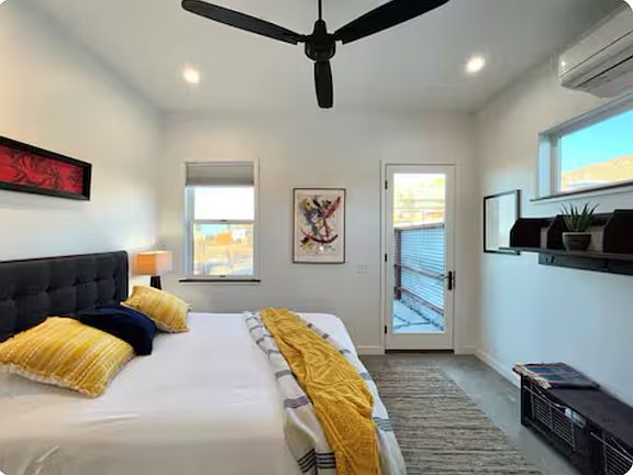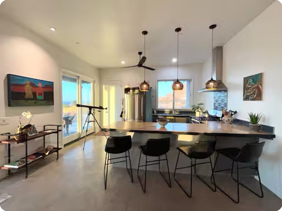 This house is a very new, modern design with concrete floors and high ceilings. There is immense natural light with big windows looking out onto the desert skyline. There is a smart TV in the living room, and there are bikes on the property so you can cruise up to the park and around the neighborhoods.