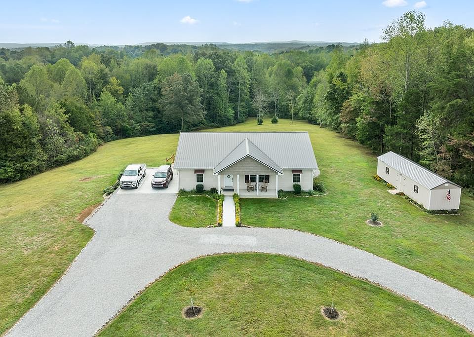 Built in 2023, this 1,470 sq ft home offers modern comfort on 5.6 private acres surrounded by mature trees. The inviting front porch welcomes you into an open layout featuring a custom kitchen with granite counters, stainless appliances, and quality finishes throughout. A spacious bathroom and whole-house water filtration system add everyday convenience. Outdoors, enjoy evenings by the fire pit or relax on the expansive back deck overlooking peaceful views. Property highlights include a 30-amp RV hookup with septic, a conditioned crawlspace, double hung windows, plus a large 12x36 storage building ideal for equipment, hobbies, or future projects. With plenty of cleared yard space and a long private drive, this move-in ready home blends functionality with country living, giving you room to spread out and enjoy. Schedule your showing today!