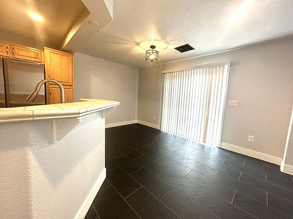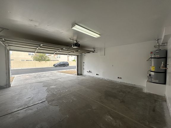 Beautiful and modern two-story home featuring three bedrooms, 2.5 bathrooms, and a two-car garage. Most are designed with a chic black-and-white color theme; this space features warm wood-tone cabinets and boasts laminate and tile flooring throughout. It also features a modern electronic fireplace, unique designer light fixtures, a kitchen with brand-new appliances, and a range hood. Two bedrooms share a convenient Jack & Jill bathroom, with ceiling fans in the bedrooms for added comfort. A large backyard with a desert landscape, easy to maintain, and perfect for outdoor living and gatherings. Location close to the casino, schools, parks, and quick access to the I-215.