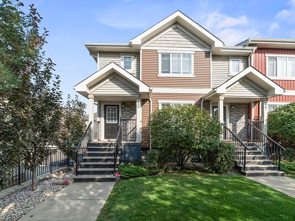 Stunning corner end-unit townhouse in highly sought-after South Terwillegar! This impeccably maintained 3 bed, 2.5 bath home features carpets, striking glass wall stairs, and extra windows that flood the home with natural light. The open-concept main floor offers laminate and ceramic tile floors, a spacious dining area, and a modern kitchen with maple cabinets, granite counters, stylish backsplash, stainless steel appliances, and pantry space. Step onto the oversized sunny south-facing deck—perfect for entertaining. Upstairs, the king-sized primary suite boasts a walk-in closet and a bright ensuite with glass shower, plus two bedrooms and a 4-piece bath. The basement includes laundry, storage, and a mudroom, while the double car garage provides plenty of space for vehicles and storage. Prime location close to schools, parks, shopping, restaurants, and quick access to Henday!