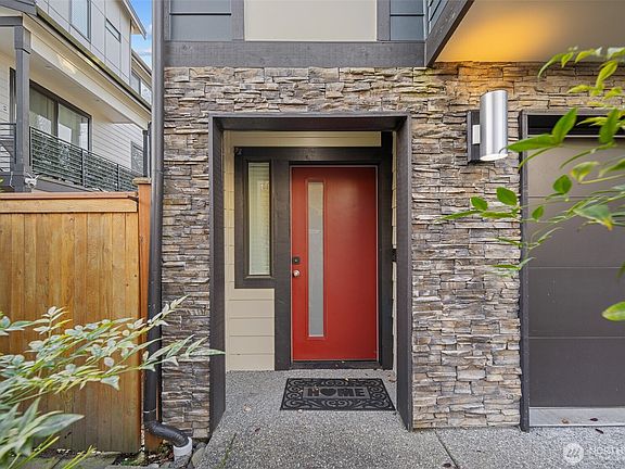 Modern corner townhome with bright southern exposure in a gated Everett community! Beautifully maintained end-unit with recent updates including new deck, landscaping, lighting, and energy-efficient mini-split A/Cs. Open-concept living features high ceilings, oversized windows, a cozy electric fireplace, plus a designer kitchen with quartz counters, stainless appliances, and peninsula eat bar. Two covered patios and a fully fenced side/backyard offer room for a dog run and outdoor entertaining. Light-filled primary suite with walk-in closet and private bath. Convenient top-floor laundry, plus a 2-car tandem garage and driveway parking.