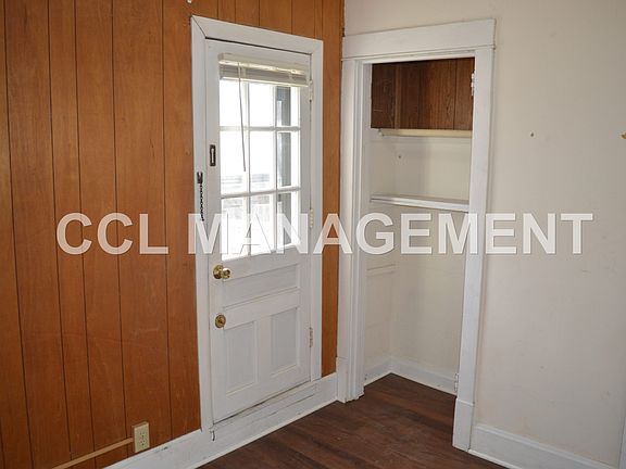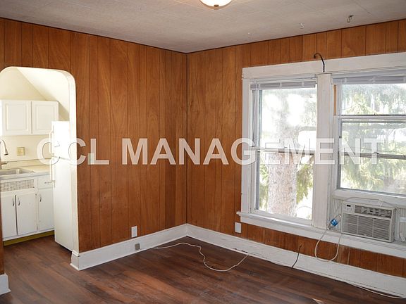 This upper unit features luxury vinyl plank flooring throughout and offers one spacious bedroom and a smaller bedroom/office. In between the bedrooms is the living room with a larger storage closet. a small kitchen and a balcony off the back.