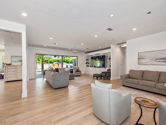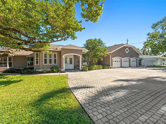 Updated 4100 sqft home Pool/Spa home with private IN-LAW SUITE is located off of McGregor Blvd, minutes from downtown Fort Myers and Cape Coral. The current owner has done an extensive remodel including opening up the kitchen, den and living room into a functional and modern great room concept. Everything about this home screams WOW, from the oversized circular driveway, 3 car garage, double entry doors, and new wood look plank floors throughout, high ceilings and custom mill work. The oversized kitchen is a chef's dream with new gray cabinets, subway tile, center island, quartz countertops, upgraded appliances, cozy dining nook, skylight, and sliders to the pool area. The great room is a perfect place for intimate family gatherings or large scale entertaining. There is also a formal dining room with tray ceiling and private office/library. The outdoor space is completely fenced/walled and offers many ways to enjoy Florida living - a large under truss area, gazebo, and paved pool area with spa! The Primary suite is a private oasis and features a two-way fireplace to the bathroom. The bathroom has a gorgeous walk-in shower with marble surround, and maple vanities with 2 sinks plus an additional makeup vanity with seating, and a large walk-in closet. Sliders are located off the owner's suite, family room, and kitchen, all leading to the covered lanai and pool deck. This home provides custom storage in each room, providing ample space to stow away.The main house also has two guest bedrooms, an additional full bath and laundry room. Freshly painted inside. The IN LAW SUITE has a separate entrance and includes a full kitchen, bedroom & bathroom, laundry area, and living room that leads to a paved pool deck. Additional highlights include a new roof replaced in 2019, dual-zone AC for the main living quarters.