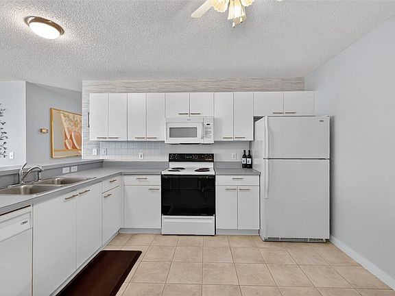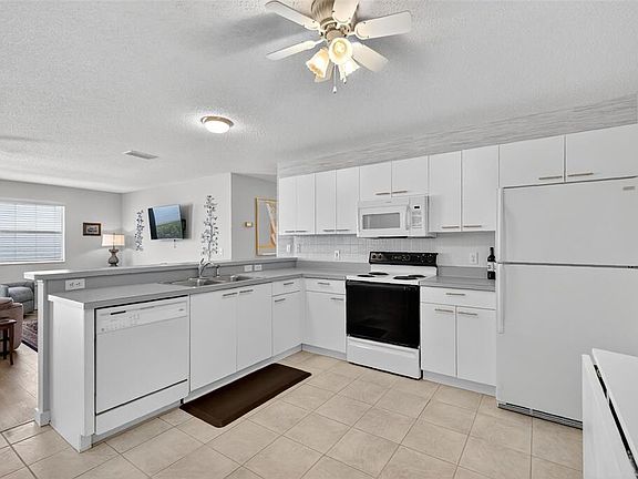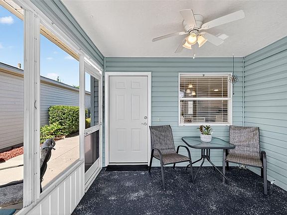 Screened lanaiCeiling fanWhite picket fenceOpen concept floor planOutside patio areaTile floorEat-in dinette area
