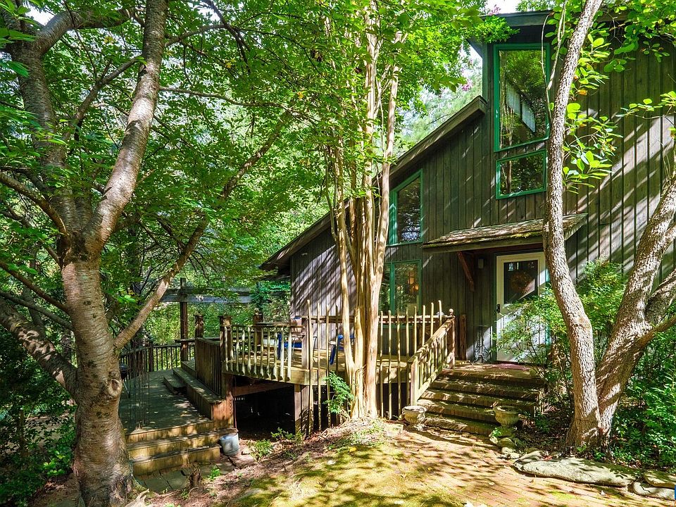 Lake House with winding creek and lake-front lot in the Greene Mountain Lake community! Just seven miles from the Shenandoah National Park, this secreted three bedroom, two bath getaway boasts spectacular views and birdwatching from the over-sized windows and three tiered wrap around deck. An architectural masterpiece, this home showcases clean lines, large windows, and an open floor plan, embracing the timeless aesthetic of mid-century modern design. The magical lot, secret garden property is a arborist dream with a terraced hillside populated with stack stone walls, contemplation patios, mature cryptomeria, cherry, Dawn Redwood, Magnolias, Rhododendron, Azalea, Witch Hazel and Lemon, all populating an artist’s landscape dream property. The generously sized living areas provide plenty of space for relaxation and entertainment. The living room features a stunning fireplace and wood stove, while the dining area overlooks the lake. The primary bedroom is located on the first floor! This design masterpiece is more than just a home; it's a lifestyle. Whether you seek tranquility, outdoor adventure, or a unique architectural experience, 729 Pine Bluff Rd offers it all!