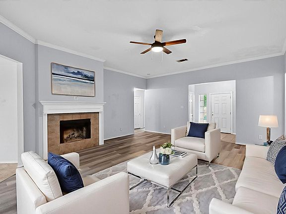Step into this inviting home featuring a smart split-bedroom design with 3 spacious bedrooms and 2 full bathrooms. The primary suite offers a relaxing retreat with a garden tub, dual vanities, and a separate shower. The expansive living area is perfect for entertaining, showcasing large windows that fill the space with natural light and a charming wood-burning fireplace for cozy evenings. The kitchen is complete with a center island, abundant cabinetry, and generous counter space overlooking the breakfast area perfect for casual dinning or entertaining.