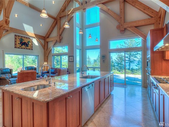 Tranquil south-facing Waterviews. Enjoy the many features of this beautiful single-level custom timber-frame home. Well-designed floorpan offers flexibility of living space w/cozy radiant-heat travertine floors. Floor-to-ceiling windows, skylights & rooms that flow naturally to outdoor stone patios. Rooms have all day sun & natural light. Gourmet kitchen w/high-end appliances & pantry. Master bedroom w/ensuite bath, soaking tub, custom shower. Roomy closets & storage. Detached 3-car garage/shop.