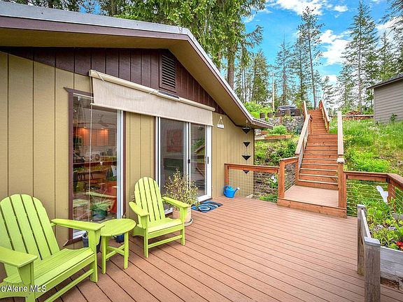 Stunning Mid-Century Modern cabin on beautiful Hayden Lake! Recent updates were made to maximize FUN and relaxation at the lake. No expenses were spared when the seller added a new upper-level composite deck designed to take entertaining to a whole new level. The remodeled bunk house can sleep 4-8 people and offers A/C and heat for a comfortable night's sleep. Durable LVP flooring was installed in the bedrooms and on the stairs to make lake life clean-up easier. Prior updates include new custom-built maple kitchen cabinets with quartz countertops, stainless steel GE appliances, new fans and lighting, wall mounted fireplaces, a new heat pump with A/C, new deck and railing and new dock and boat slip. Big lake views are included in the price! Be prepared to fall in love with everything this lakefront gem has to offer!