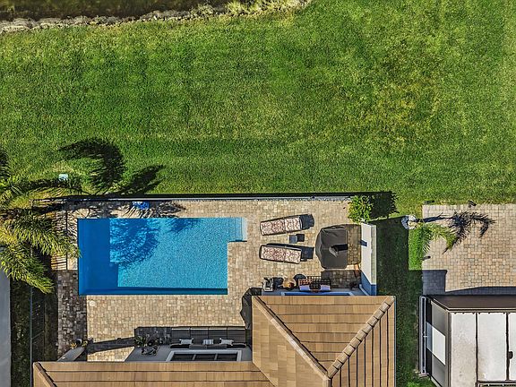 Fall in love with this recently built single-story Rio Grande home featuring modern stone accents, a flat tile roof, all impact glass, natural gas, a stunning pool and lake views. Enter a spacious foyer with sconces and 10' ceilings leading to an open layout with LVP flooring. The gourmet kitchen offers a waterfall quartz island, stainless farmhouse sink, GE Profile appliances, 5-burner gas cooktop, vent hood, microwave, and convection oven, along with upgraded cabinets and beautifully tiled backsplash. Whole house water filtration. Enjoy the covered patio and gas-heated pool overlooking the lake, a true oasis. The primary suite includes a 10'8'' tray ceiling, great views, walk-in closet, and a spa-like bathroom with dual vanities, soaking tub and large shower.