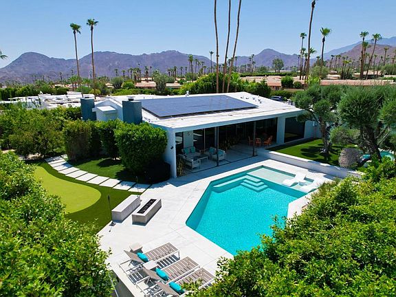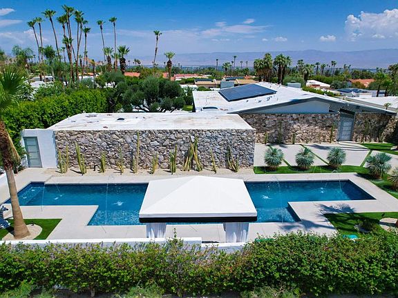 Unique and one of a kind opportunity! Featuring a mid-century roof line and facade expertly designed and built in 1964 by Stanton F. Graham in the Eldorado Highlands neighborhood. No detail is lacking on this S. Palm Desert architectural gem on a very private 12,197 oversized lot. The home offers 4 Beds, 4 Baths, vaulted ceilings, and killer 360 views of mountains and the valley. Enjoy your master suite with walk in closet, fireplace, private patio, and walk in shower connected to your outdoor shower. Two additional bedrooms in the main house, one en suite and one with a dedicated bathroom. The kitchen island is over 13 feet long. Sunken living room with fireplace and a large wall of glass is perfect for entertaining with indoor/outdoor ambiance. The expansive master-like en suite casita enjoys a mini bar area with sink and fridge as well as privacy. The casita offers many opportunities, separation for guests, rentability, your call. Complete and tranquil privacy here, with your own firepit, covered patio areas, astro turf putting green, and an elevated huge spa alongside two pools - one for doing laps and one for partying. Expertly chosen finishes, tile, appliances, custom features, electric shades, solar...you name it, this place has it all! Fully furnished and even the brand new golf cart is included so you can cruise to El Paseo and have dinner the night you move in. Live your dream HERE!