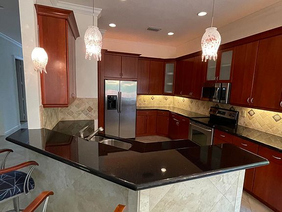This beautiful Atlantic model with plenty of natural lighting is located in beautiful Valencia Pointe. This home boast a large gourmet kitchen with granite counters, SS appliance package with wood cabinetry and a charming breakfast nook. Its stunning separate dining and living room give the home an open floor plan. The large master room features vaulted ceiling . The Roman woven blinds decorate the entire house with an elegance which provides perfect desired lighting. Many decor features that create a tasteful contemporary design throughout this spectacular home. The covered screened in patio is a private oasis. The windows all have accordion shutters.