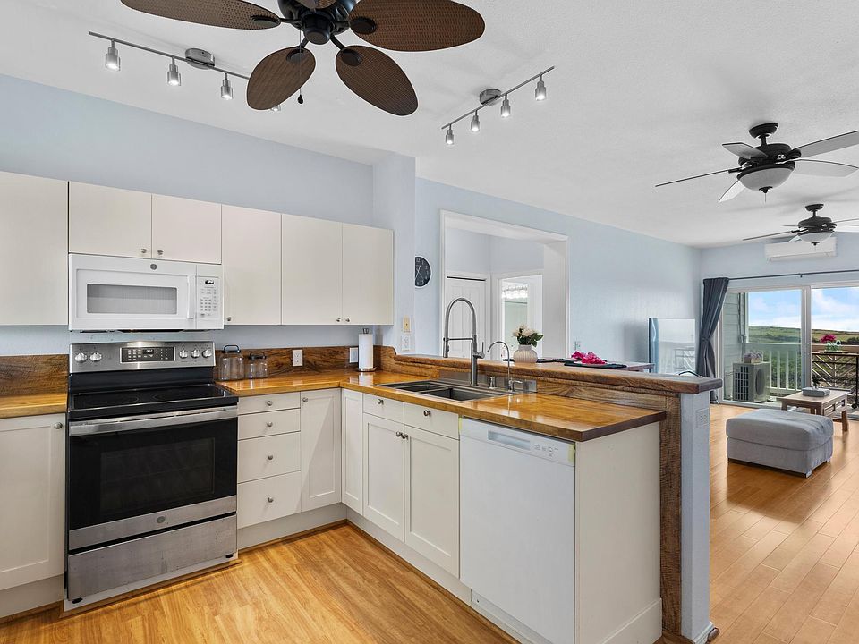 ✨ Stylish Kitchen – Featuring maple butcher block countertops, a custom mango wood bar top, and new appliances including a dishwasher, and over-the-stove microwave.