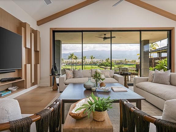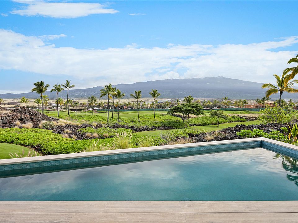 Designed for effortless entertaining, the gourmet kitchen features Wolf appliances and bar seating, flowing seamlessly into the vaulted great room and out to the covered lanai—ideal for enjoying the indoor/outdoor lifestyle Kona is celebrated for. The outdoor spaces include a BBQ area, pool and spa, and ample room to relax in the island breeze.