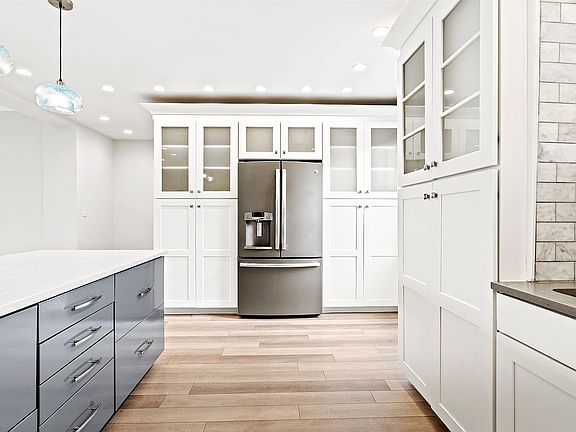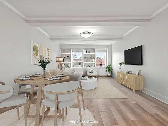 A beautifully renovated 2-bedroom apartment features custom millwork and thoughtful built-ins, including a pantry in the open-concept kitchen, which flows into a spacious living and dining area. The kitchen island features suede Silestone and has plenty of room for seating. A long hallway from the entrance provides privacy. Enjoy new flooring, doors, and a massive walk-in hallway closet. The two generous bedrooms offer double exposure, with one facing the serene building courtyard and the other overlooking Austin Street. The designer bathroom boasts modern fixtures, exquisite tilework, and a separate shower and tub for a spa-like experience. Both bedrooms feature ample closet space, and the unit is freshly painted with elegant crown molding and coffered ceilings.