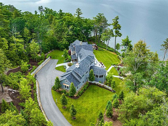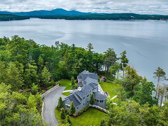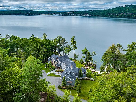 Discover the epitome of lakeside luxury at this extraordinary estate on Spindle Point in Meredith, NH. With its premier location, this one-of-a-kind waterfront property offers sweeping views of Lake Winnipesaukee and unforgettable sunsets from every room. Boasting 407 feet of natural waterfront, including 5 docks and a perched beach, this home is a true haven for lake enthusiasts. The main level features an open concept Great Room with soaring Douglas Fir wood ceilings, a striking 2-story stone gas fireplace, and floor-to-ceiling windows that capture the essence of lake living. The chef's kitchen is a culinary masterpiece, complete with a walk-in pantry, granite countertops, top-of-the-line Thermador appliances, and a wine cooler. Indulge in relaxation and entertainment in the four-season porch, equipped with a gas fireplace, BBQ, and kitchenette. The first-floor master suite offers a private oasis with a claw foot soaking tub and a custom shower. Upstairs, each bedroom has a private ensuite bath, and a family room awaits movie nights with a popcorn maker. Enjoy a maintenance-free lifestyle with a fully irrigated exterior, landscape lighting, and a robotic lawn mower. The property also includes a guest house with a 3-car garage, gym, two bedrooms, and a deck overlooking the lake. Every detail has been meticulously crafted to ensure the utmost comfort and convenience. Escape to this remarkable waterfront retreat, where the beauty of Lake Winnipesaukee unfolds before your eyes.