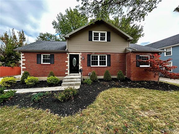 Welcome to this stunning 5-bedroom, 2-bath home nestled in the desirable Deerhurst Park neighborhood located in the Town of Tonawanda. The charming brick facade offers excellent curb appeal, complemented by an expanded driveway leading to a spacious 2-car garage. Step inside to a large living room and dining area, perfect for entertaining, featuring a cozy gas fireplace. The updated kitchen boasts tile flooring, cherry cabinets, granite countertops, and stainless steel appliances—ideal for modern cooking. Both bathrooms have been tastefully renovated, adding to the home's appeal. Enjoy outdoor gatherings in the private backyard with a spacious Trex deck. Recent updates include newer windows and a newer furnace, ensuring energy efficiency and comfort. This move-in-ready home combines classic charm with modern updates in a friendly community. Don’t miss out on this exceptional opportunity!