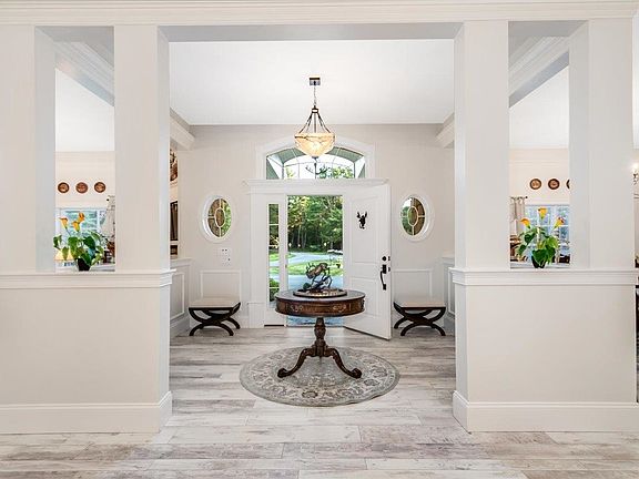 IMPROVED PRICE! Exceptional and immaculate 6 bedroom and 4.5 baths Contemporary Ranch with full in-law suite situated on 4.82 acres on private cul-de-sac! This home offers elegance and luxury at its finest. Drive in and enjoy the impeccable new landscaping, natural stone fire pit, New England style rustic rock wall with pond, circular driveway with double tear water fountain for an inviting serenity. As you enter the home you'll see the grand family room with beautiful chandeliers hanging from the 10ft+ceilings, gas fireplace and crown molding creating a sophisticated ambiance. Spacious kitchen with granite counter tops, new 5 burner gas cooktop, double wall oven, stainless steel appliances and a huge walk in pantry. Primary suite has tray ceiling lighting, huge walk-in closet, dressing room and a gorgeous European Style custom tiled shower with dual shower heads and glass doors. Stunning heated attached oversized 2 car garage with epoxy floor, hot/cold water, built-ins and workshop. Walk out back to a huge 22x20 detached garage with plenty of storage space. Above the garage is a 900sqft in-law suite with kitchen, living room, full bath, bedroom and has its own laundry room. Finished walkout lower level with half bath, sauna and ample storage space. More features include radiant heating, central air, house generator, freshly painted, new roof, new gutters, new light fixtures, 16 zone irrigation system with Bluetooth programmable and all new LED lighting. Move right in!