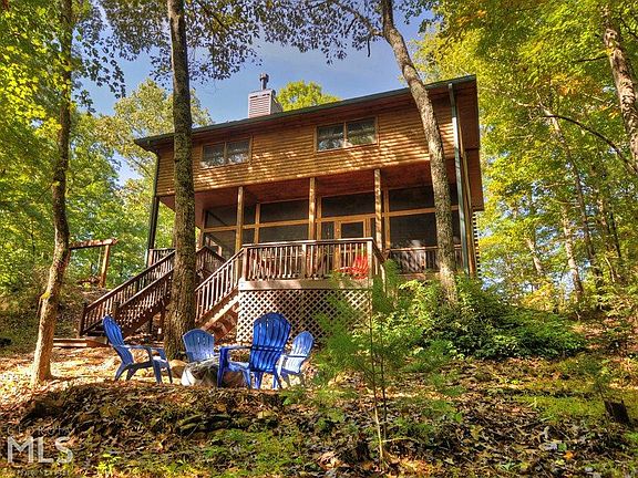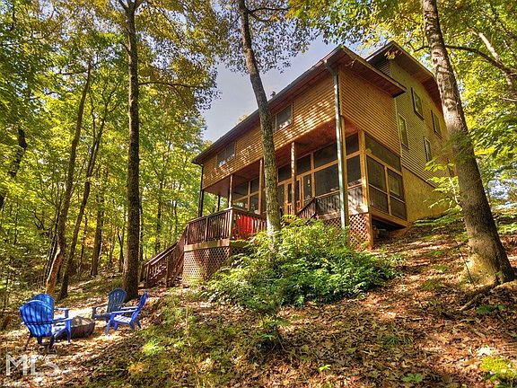 Peace & privacy... This lovely getaway is perfect for all walks of life whether you desire part or full-time or are in search of the rental investment, as it offers an abundance of space for you & the family, as well as for guests. This log cabin offers a great open floorplan, soaring cath. ceilings, stacked stone fp, & fantastic outdoor space w/ expansive decking including a screened porch to enjoy the great outdoors. In addition to great living space, the full fin. bsmnt offers a unique setting for entertainment w/ a full bar & lounge & game rm. Nestled in a majestic setting, this home sits on a gently wooded tract tucked away just min. away from Hwy. 515-a very short drive from both Blue Ridge & Ellijay.